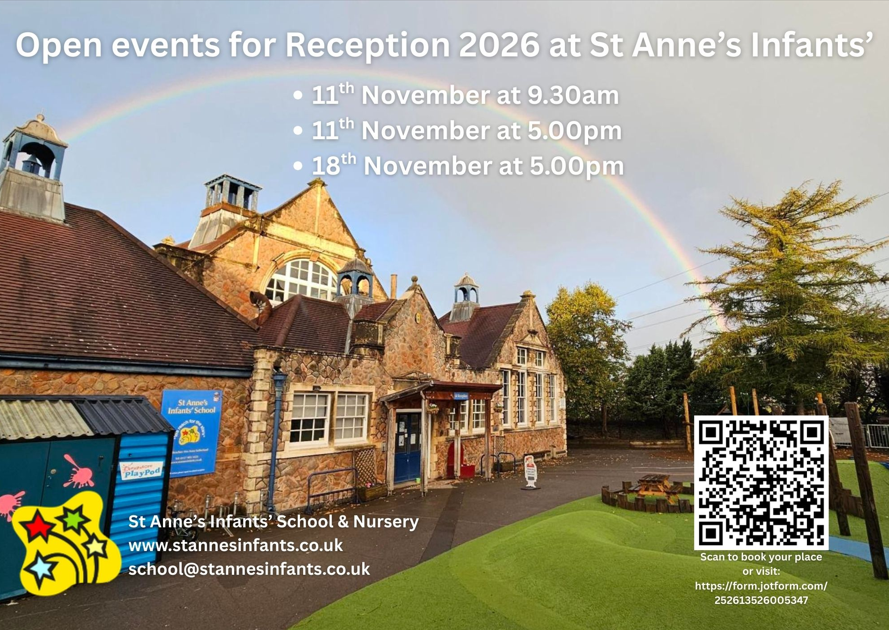 Please click the link or scan the QR code in the image to book your place: Reception open events for 2026 intake - St Anne's Infants School & Nursery .